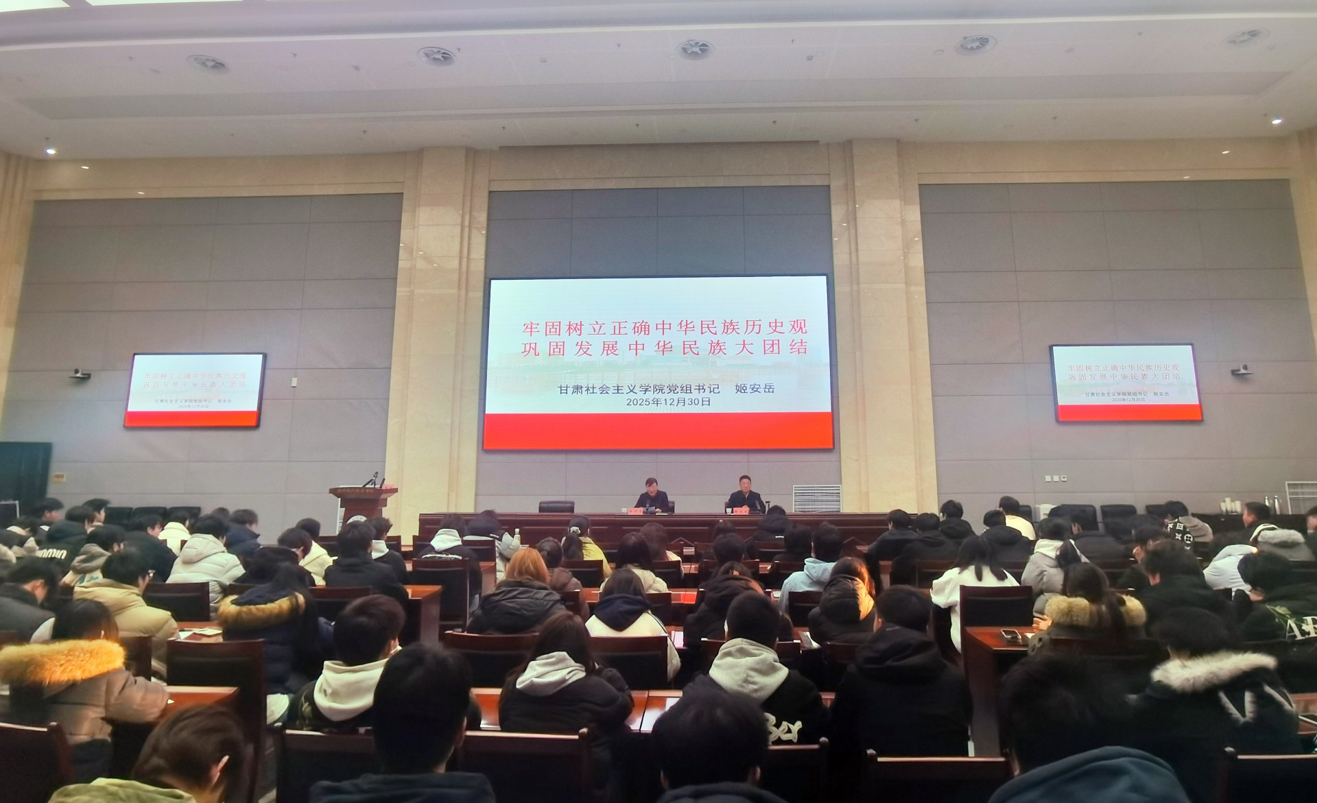 姬安岳以“牢固树立正确中华民族历史观 巩固发展中华民族大团结”为主题,以目前国际政治、经济、安全等格局深刻调整带来的挑战为背景,精彩阐述了习近平总书记关于加强和改进民族工作的重要思想的核心要义、精神实质、丰富内涵,引导师生立足“五个共同”,树立正确的中华民族历史观,不断增进对伟大祖国、中华民族、中华文化、中国共产党、中国特色社会主义的认同。